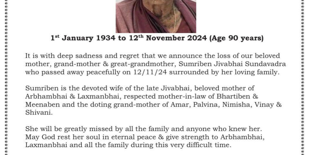 Nov132024News Category: NewsBy Krishna ModhwadiaNovember 13, 2024Tags: LMCA NewsShare this postShare with FacebookShare with Google+Share with TwitterShare with PinterestShare with LinkedIn Author: Krishna Modhwadia Post navigationPreviousPrevious post:2024 Navratri & Sharad Punam Income & Expenditure SummaryNextNext post:Sumriben Murubhai Karavadra Passed AwayRelated postsChildren’s Shiv Pooja 2025 at Maher CentreAugust 9, 2025LMCA AGM on Sunday 27 April 2025April 26, 2025Ranmalbhai Sukabhai Keshwala Passed AwayMarch 29, 2025Nilesh Keshubhai Odedra Passed AwayMarch 29, 2025Deviben Rameshbhai Odedra Passed AwayMarch 29, 2025Lakhubhai Modhwadia Passed AwayMarch 29, 2025